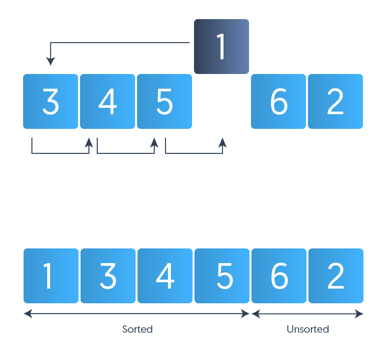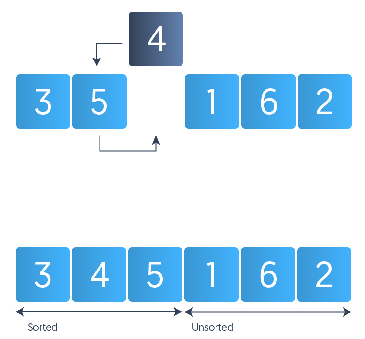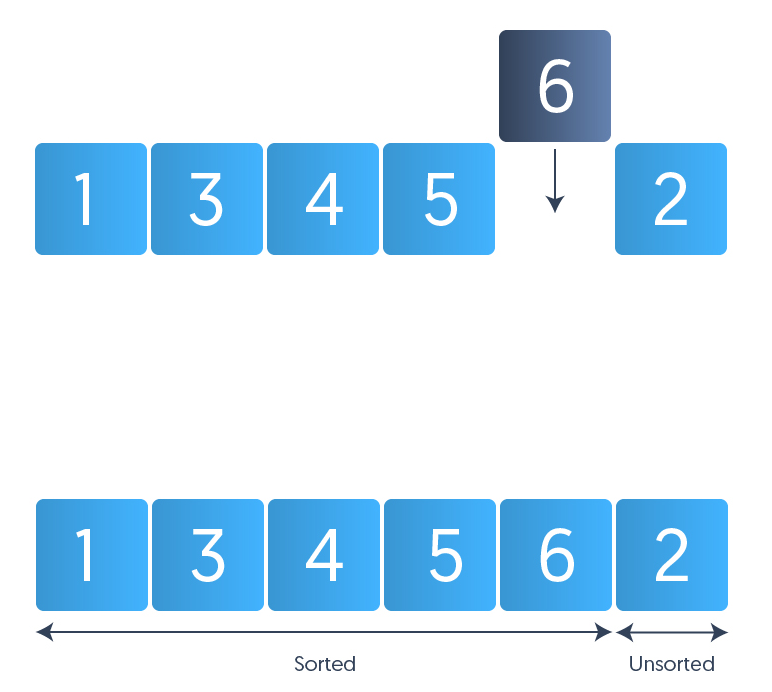 비교하는 마지막 정렬된 요소보다 작거나 같은 요소를 찾을 때까지 계속 순회하며 적절한 위치에 해당 요소를 삽입합니다.