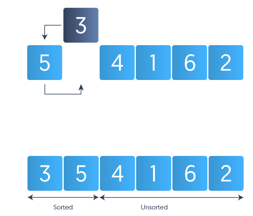 위 배열을 오름차순으로 정렬하기 위한 삽입 정렬 알고리즘은 다음과 같이 동작합니다.