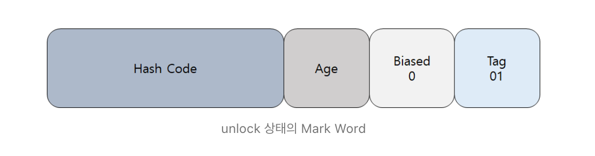 이 중 Lock 정보를 담고 있는 헤더 부분을 Mark word 라고 부르며 벤더사별로 상이하나 일반적으로 32 bit 또는 64 bit 로 구성되어 있습니다. 객체가 아직 Unlock 상태라면 객체의 고유 정보를 담고 있습니다.