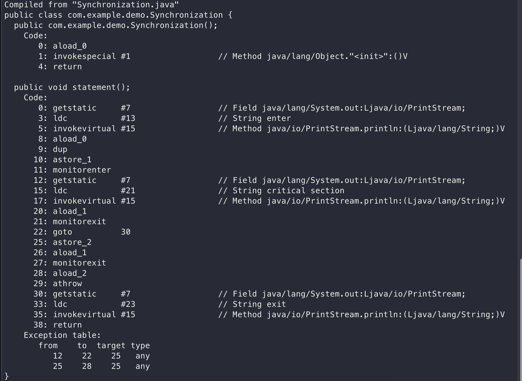 } 해당 객체에 대해 Monitor 를 점유하려는 모든 쓰레드는 같은 synchronized 구문이 실행되는 동안 대기 상태(BLOCKED)에 빠지게 됩니다. 또 위의 코드를 컴파일하여 Byte Code를 살펴보면 MONITORENTER , MONITOREXIT 라는 코드를 볼 수 있습니다.