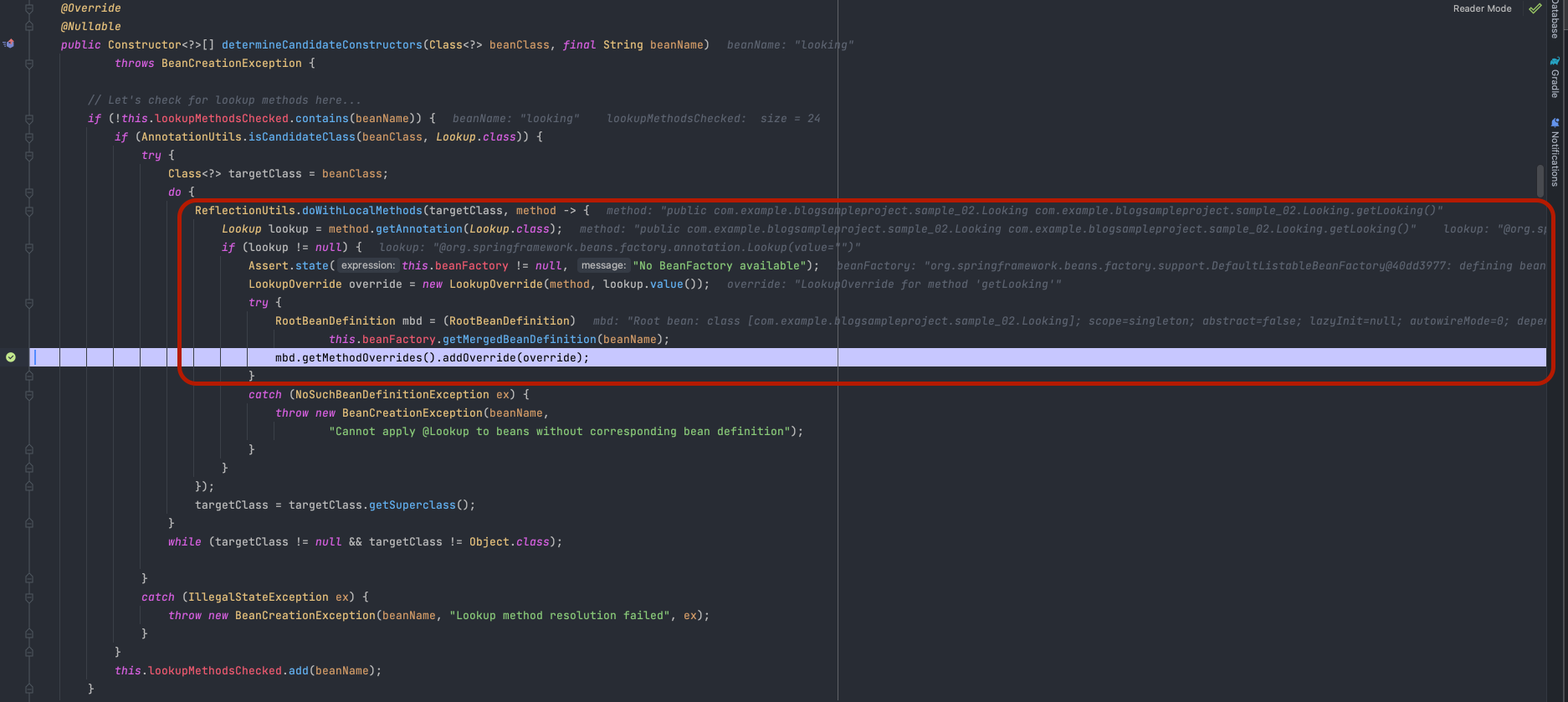 그 중 @Autowired, @Value, @LookUp..어노테이션이 명시된 메소드 또는 필드를 처리하는 빈 후처리기인 org.springframework.beans.factory.annotation.AutowiredAnnotationBeanPostProcessor를 통해서 @LookUp 메소드 재정의를 진행합니다.