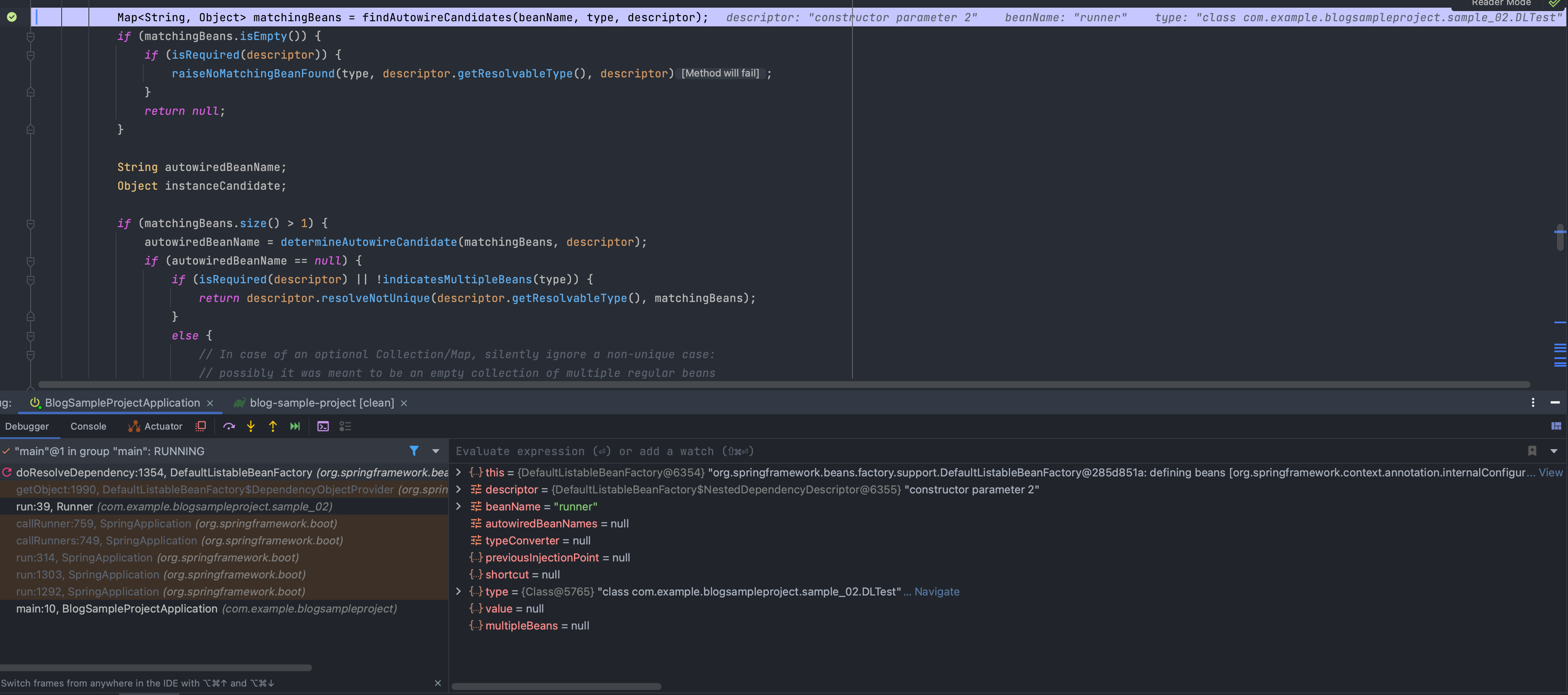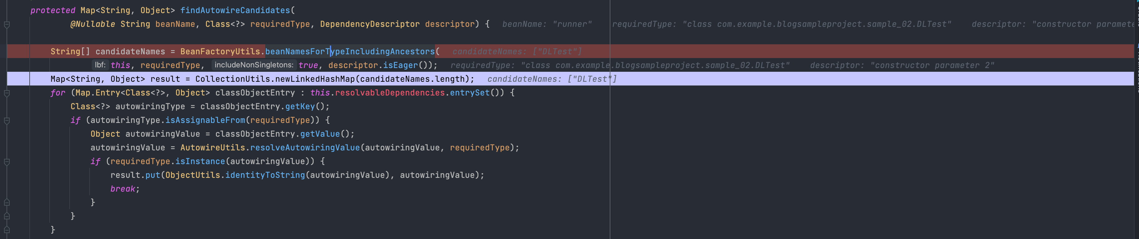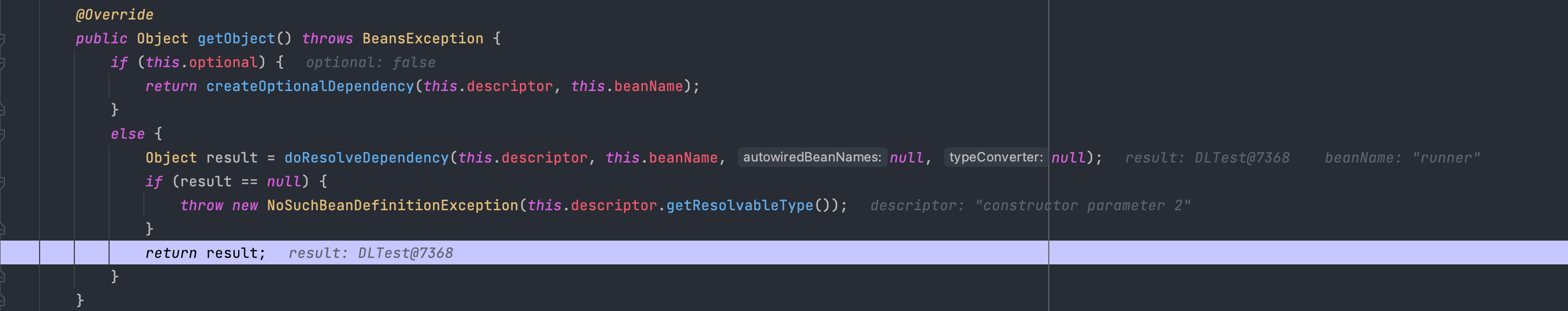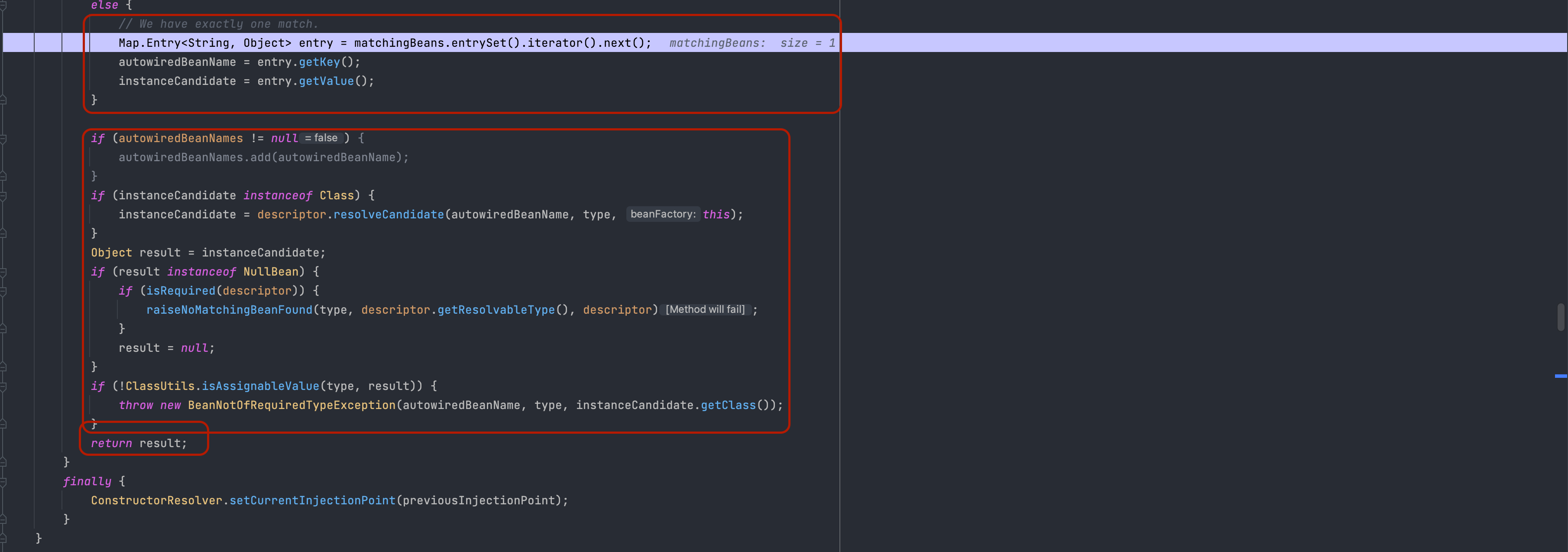 정상적으로 매칭되는 빈을 찾았다면, Null, NullBean, Class Type, Assignable 여부를 확인 한 후 context에서 조회 된 빈 객체를 개발자가 의존성을 조회한 코드상으로 반환합니다.