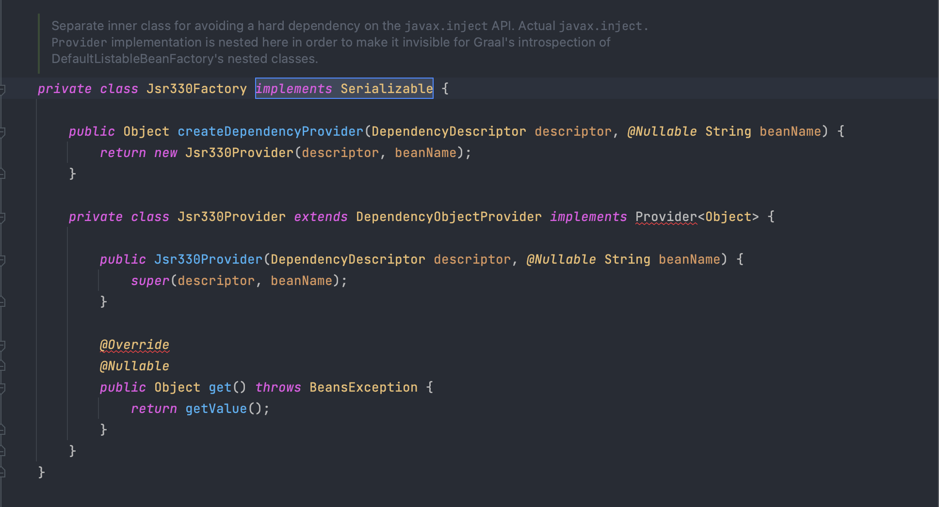 스프링은 내부적으로 javax.inject API에 대한 Hard Dependency를 방지하기 위해 DefaultListableBeanFactory의 내부 클래스로 분리하여 javax.inject.Provider를 구현했습니다.