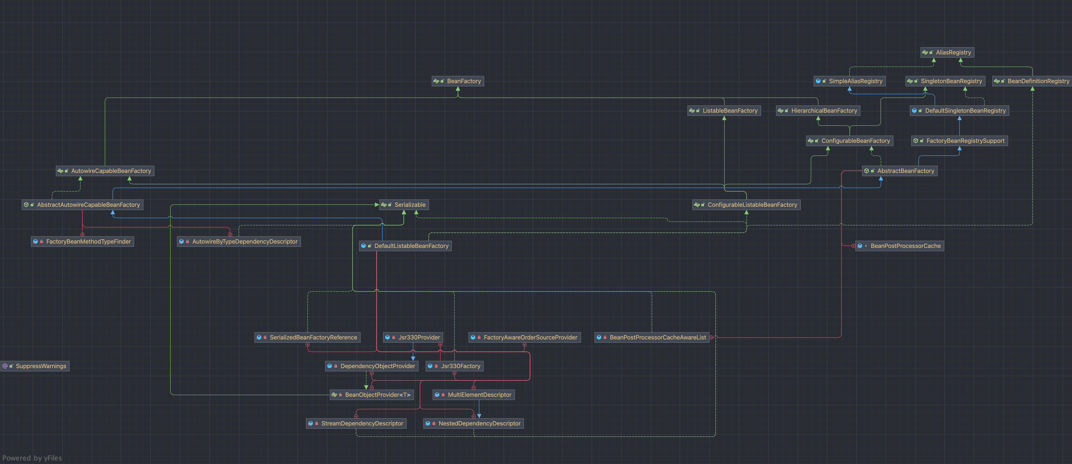 org.springframework.beans.factory.support.DefaultListableBeanFactory는 스프링의 ConfigurableListableBeanFactory와 BeanDefinitionRegistry 인터페이스의 기본 구현체로 빈 정의 메타 데이터를 기반으로 한 완전한 빈 팩토리입니다.