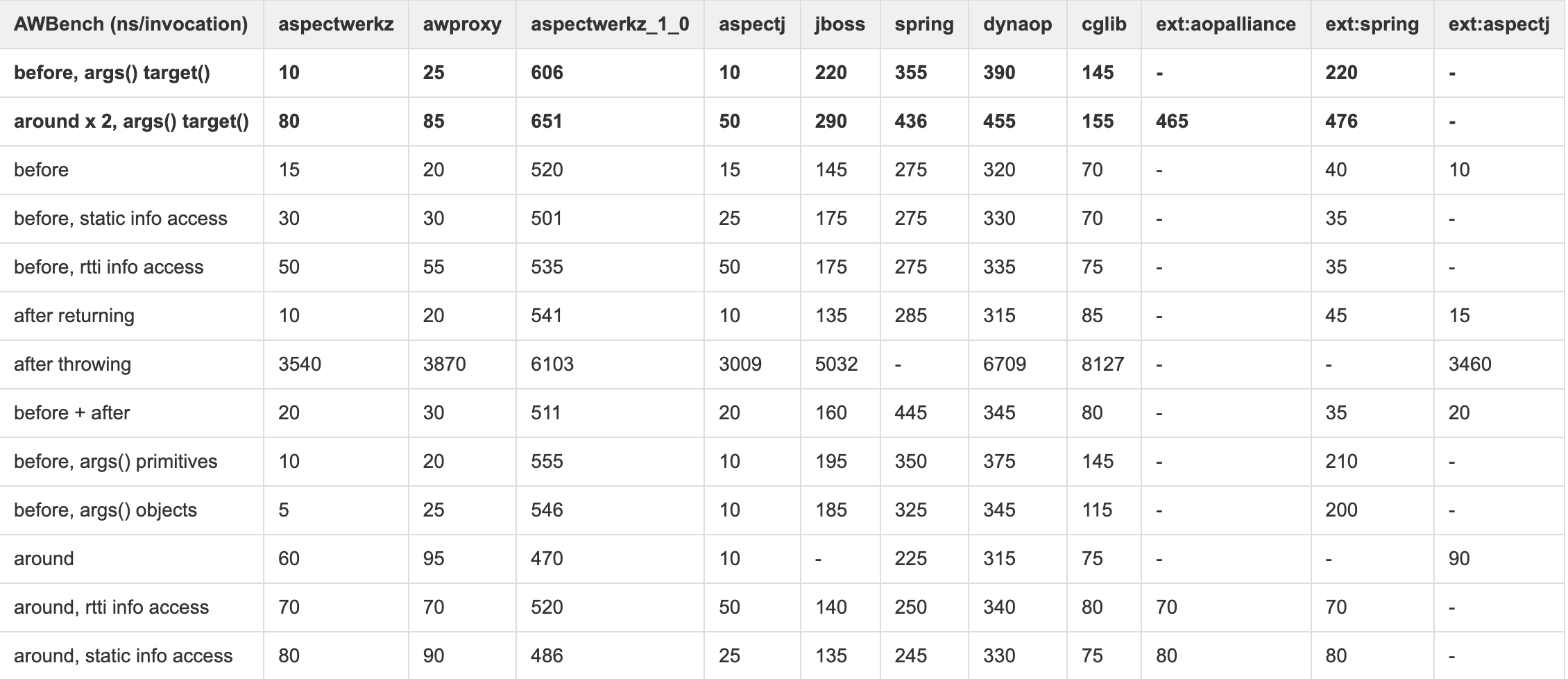 또한 AspectWerkz, AspectJ, JBoss AOP, Spring AOP, CGLIB ... 와 같은 AOP 프레임워크 성능에 대한 밴치마크는 바이트 코드를 조작하는 CGLIB가 Spring AOP(JDK Dynamic Proxy)보다 높은 수치를 나타냅니다.