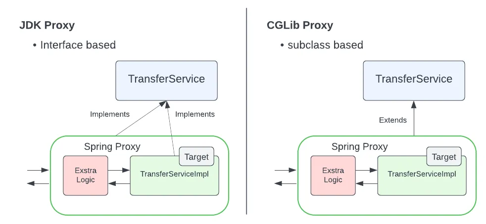 - AOP Proxy: AOP 프레임워크가 Aspect(Advise 메소드 실행 등)을 구현하기 위해 생성한 객체로 Spring Framework에서 AOP Proxy는 JDK Dynamic Proxy 또는 CGLIB Proxy입니다.
