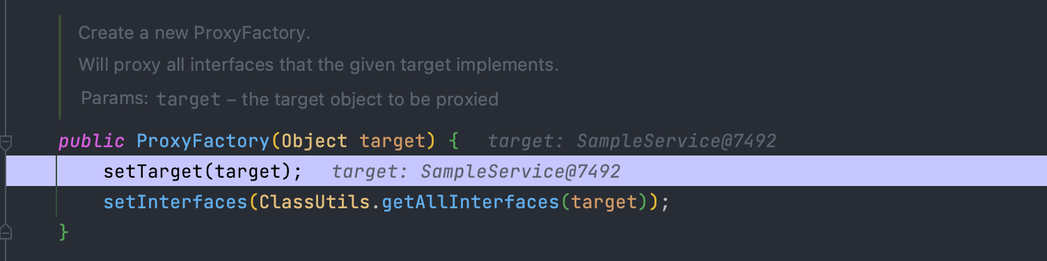 먼저 ProxyFactory 객체를 생성하면서 대상 객체를 등록합니다.