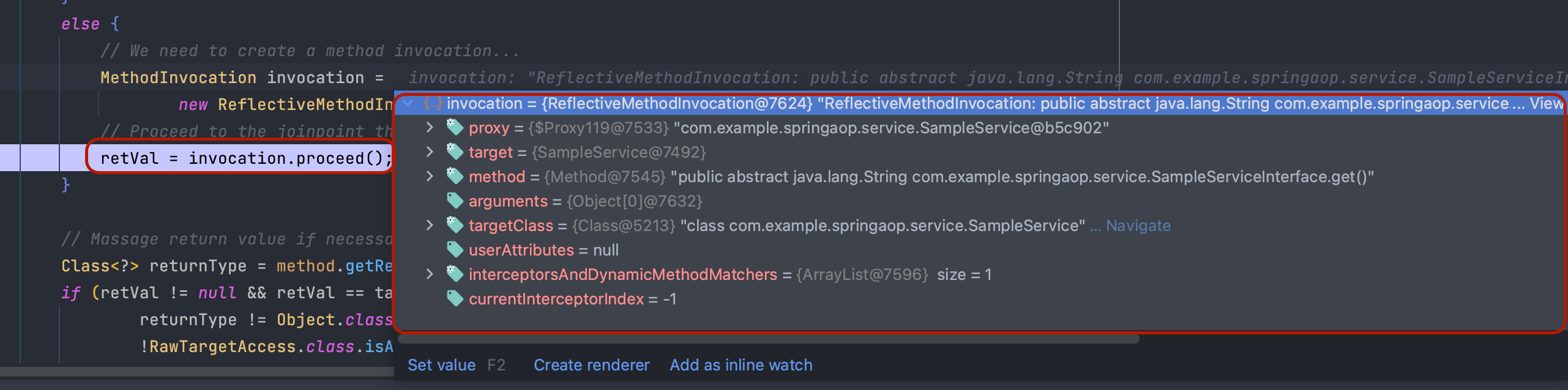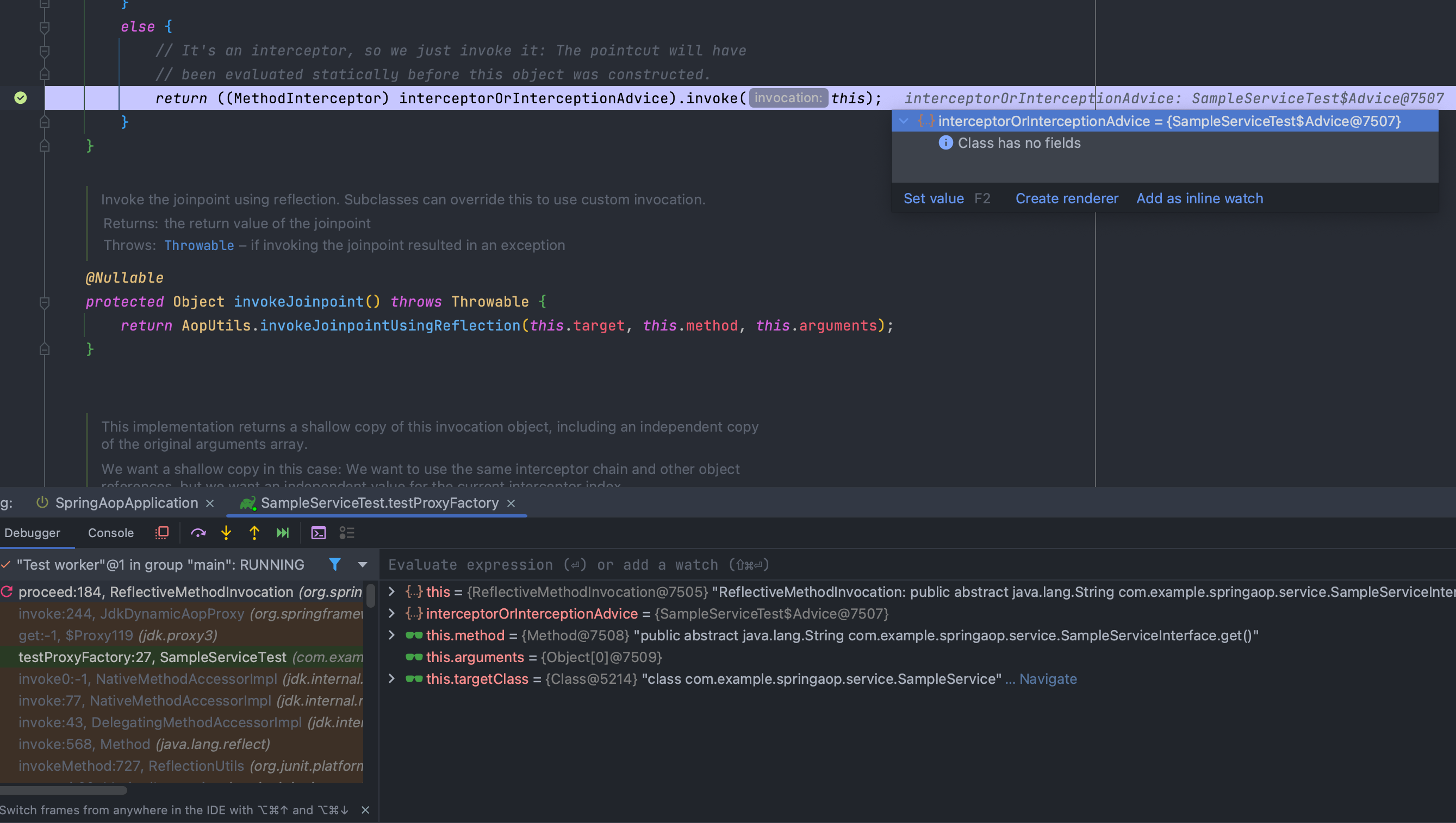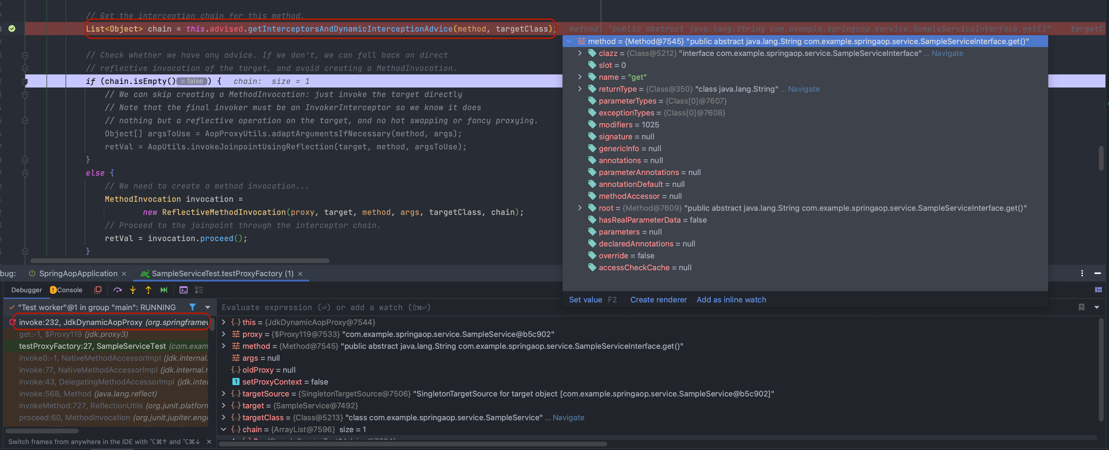 각 타입에 맞게 생성된 프록시는 대상 객체의 메소드를 위임 받아 실행시키는데 ProxyFactory에 등록된 Advisor들의 Adivce Chain 형태로 실행시킵니다.