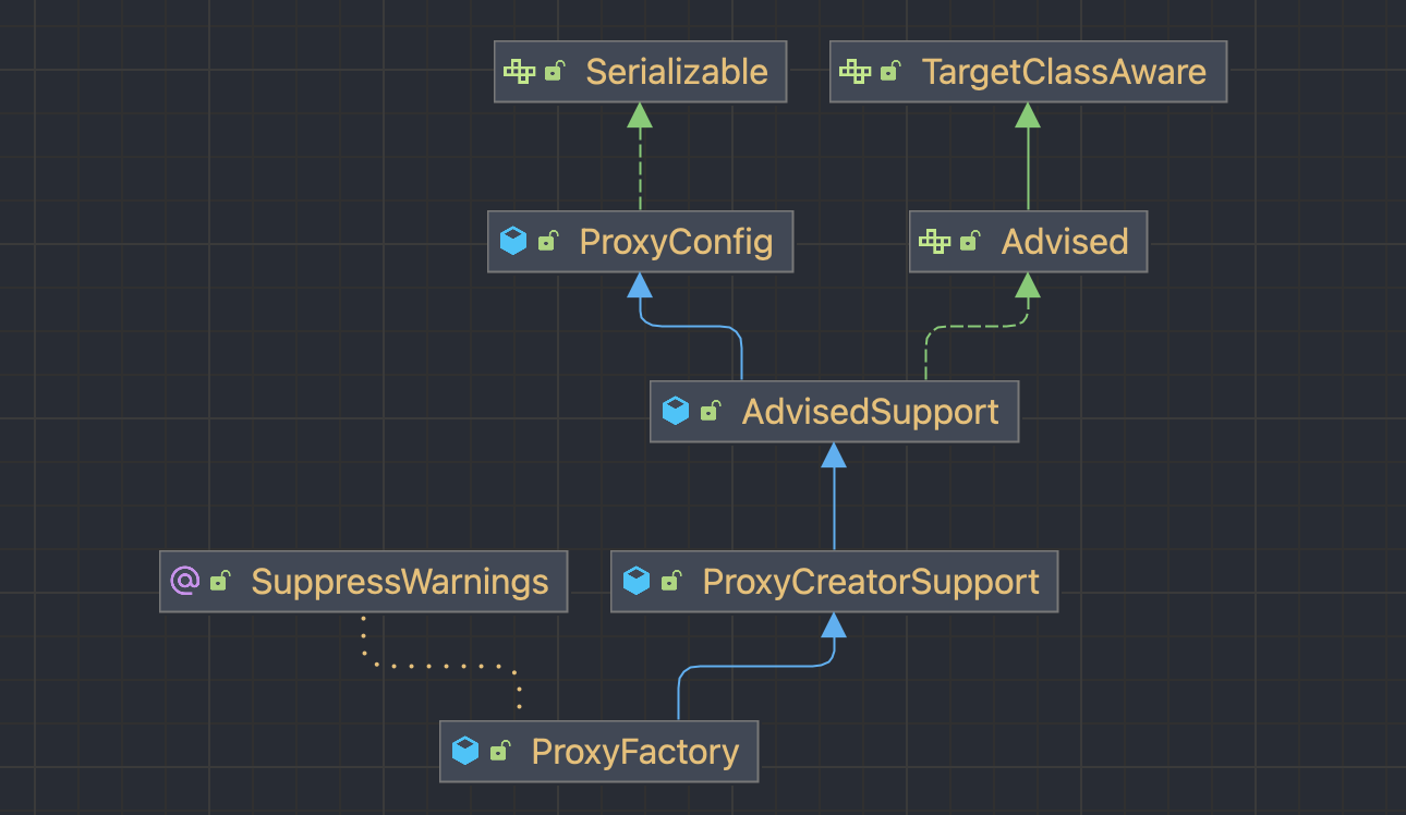 위와 같은 기능들을 제공해주기 위해 스프링은 ProxyFactory를 제공하며 구성 가능한(configurable) AopProxyFactory에 대한 편리한 액세스를 제공하는 ProxyCreatorSupport가 프록시 객체를 생성하고 실제 AopProxy에 접근합니다.