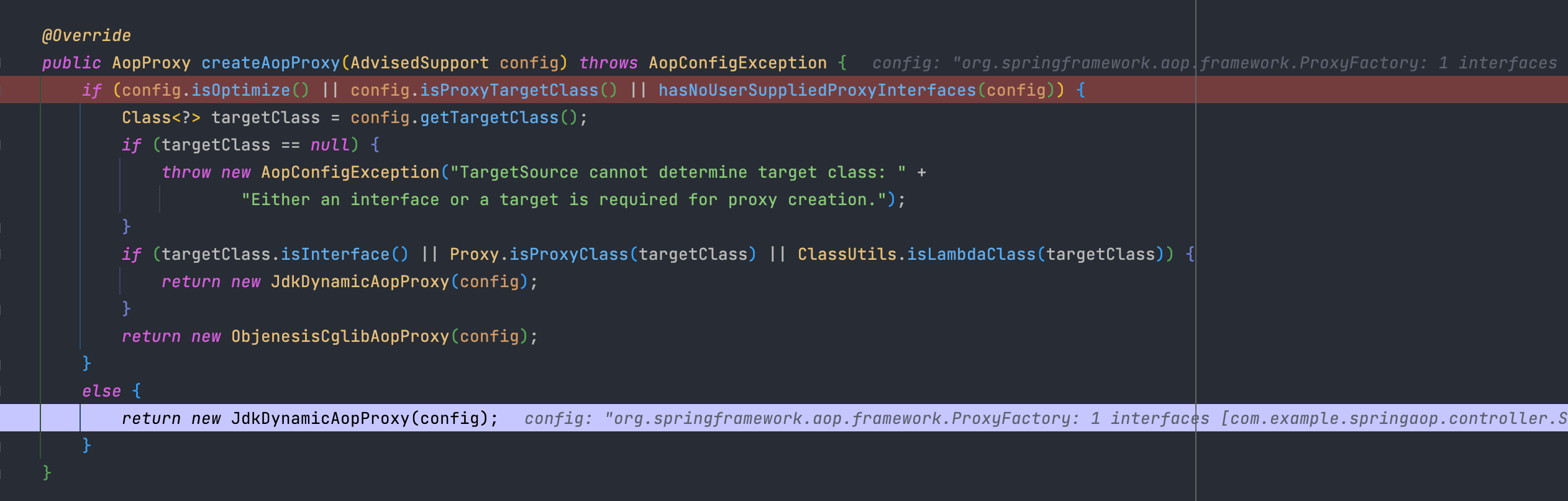 기본 구현체인 DeafultAopProxyFactory는 매개변수로 전달받는 ProxyConfig를 구현한 org.springframework.aop.framework.AdvisedSupport 클래스를 통해 대상 클래스의 프록시를 생성합니다.