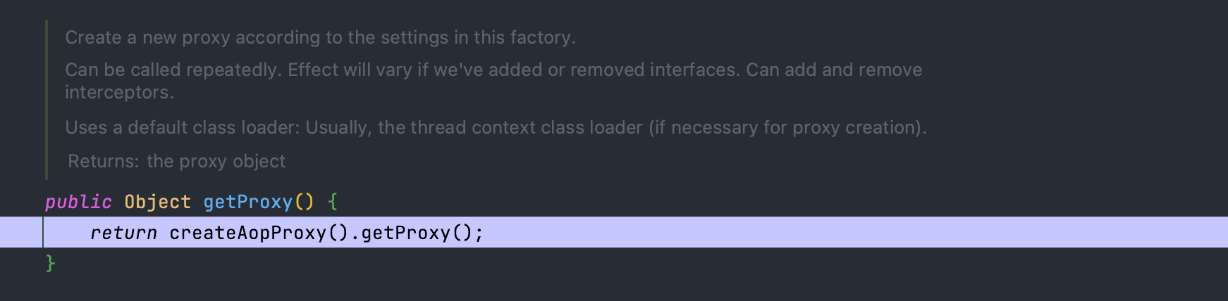 설정 및 생성이 끝났다면 ProxyFactory는 getProxy() 메소드를 통해 설정에 따라 새로운 프록시를 생성합니다.