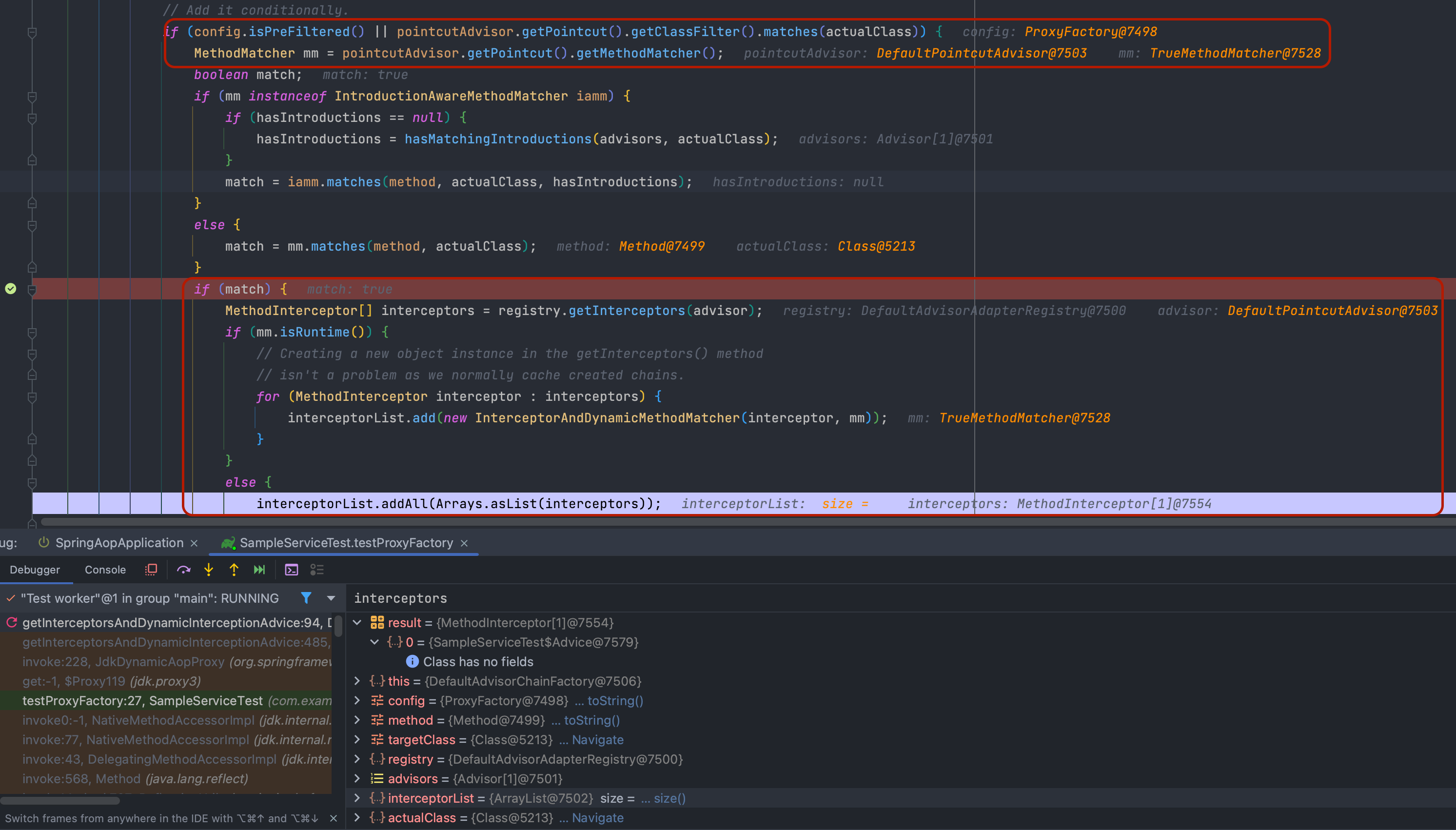 Advisor 리스트에 있는 Pointcut을 비교한 뒤 일치하는 MethodInterceptor(ProxyChain)를 추가합니다.
