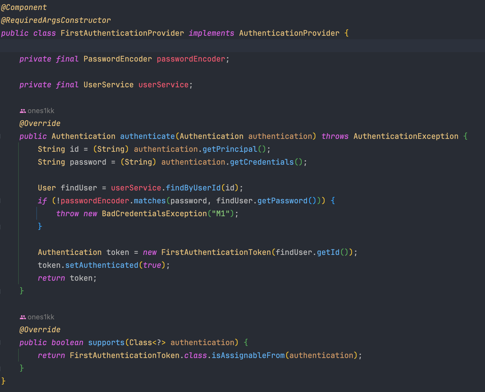 AuthenticationProvider 를 상속 받아 사용자 정의 FirstAuthenticationProvider 를 정의한 후 AuthenticationManager 에 등록 시킵니다.