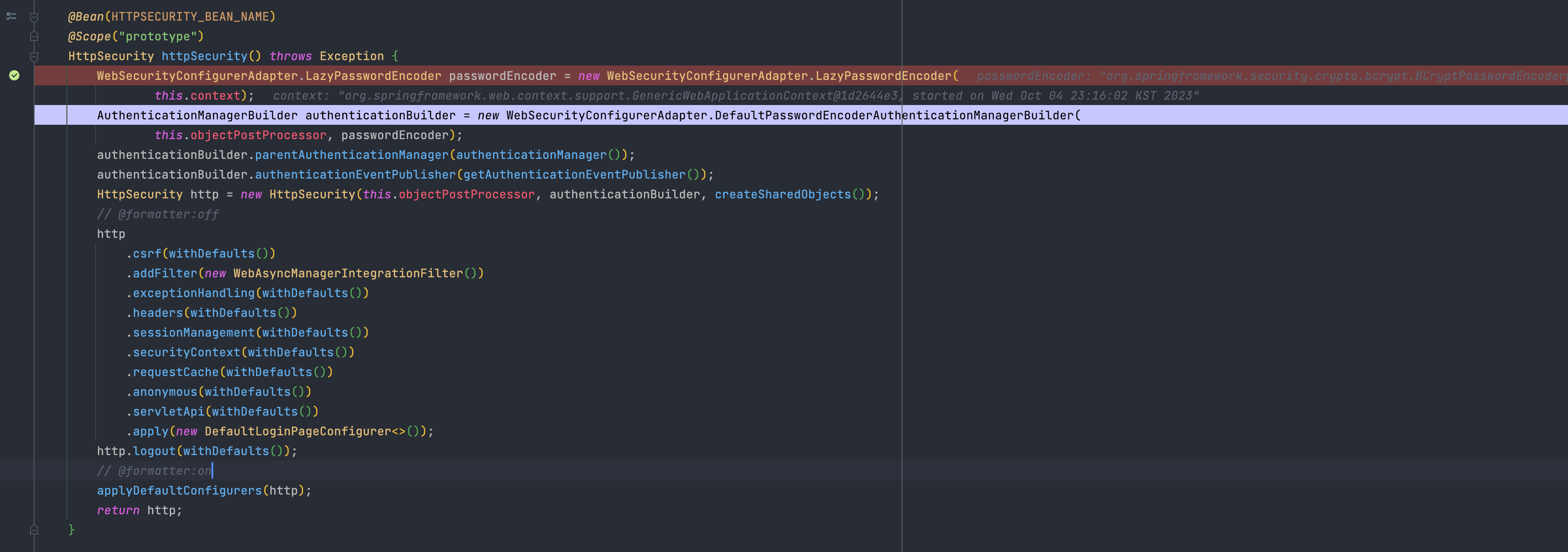 HttpSecurityConfiguration 는 HttpSecurity를 빈으로 등록하기 위해 필요한 AuthenticationManager, AuthenticationEventPublisher, PasswordEncoder 등 설정에 필요한 인스턴스들을 주입 받고 prototype scope 빈으로 생성합니다.