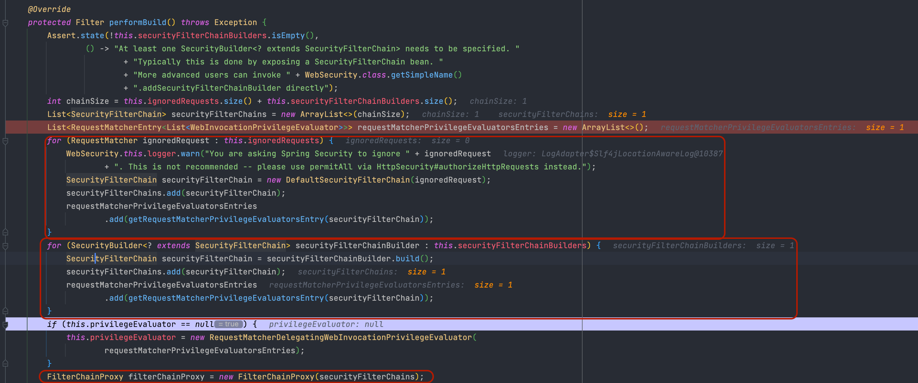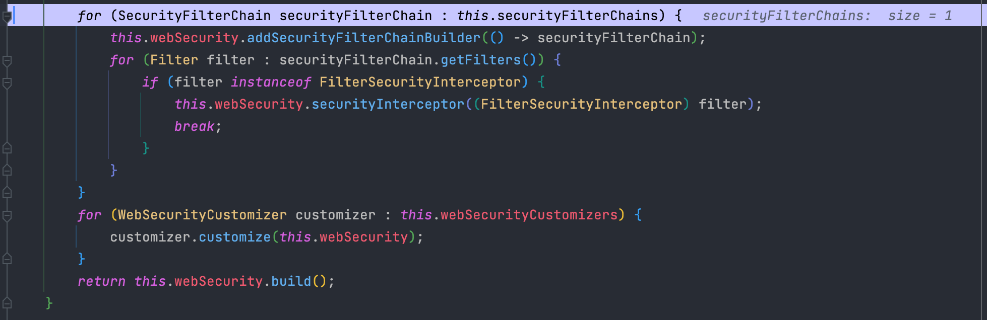 WebSecurityConfiguration 에서 전달 받은 사용자 정의 설정들을 통해서 실제 WebSecurity 객체를 생성하기 위해 빌드 메소드를 호출합니다.