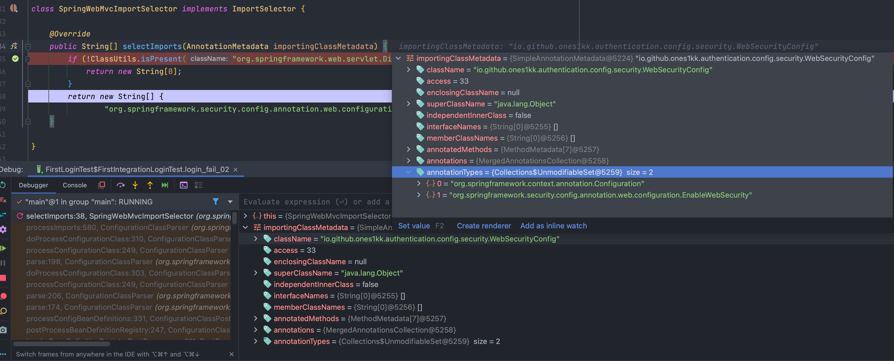 그 중 SpringWebMvcImportSelector는 @EnableWebSecurity 이 선언된 설정 파일 정보를 불러옵니다.
