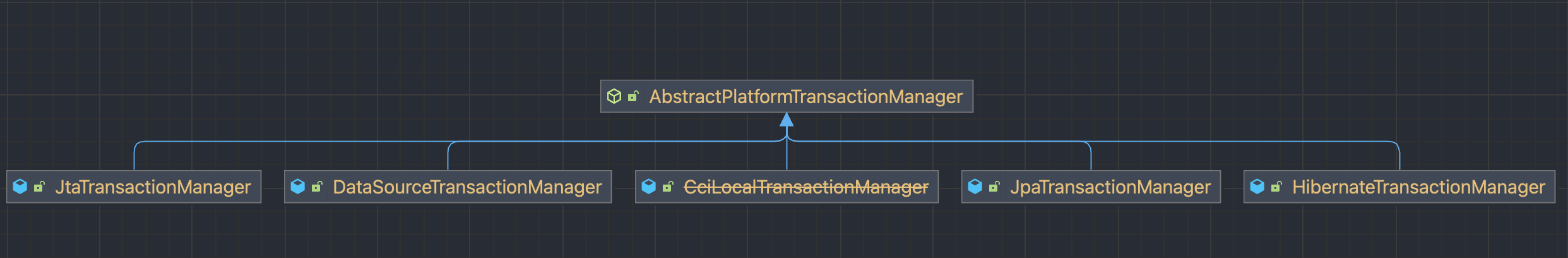 기본 구현은 JtaTransactionManager, DataSourceTransactionManager 로 다른 트랜잭션 전략에 대한 가이드 역할을 제공하고 있습니다.