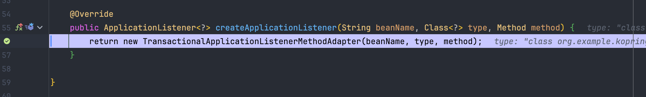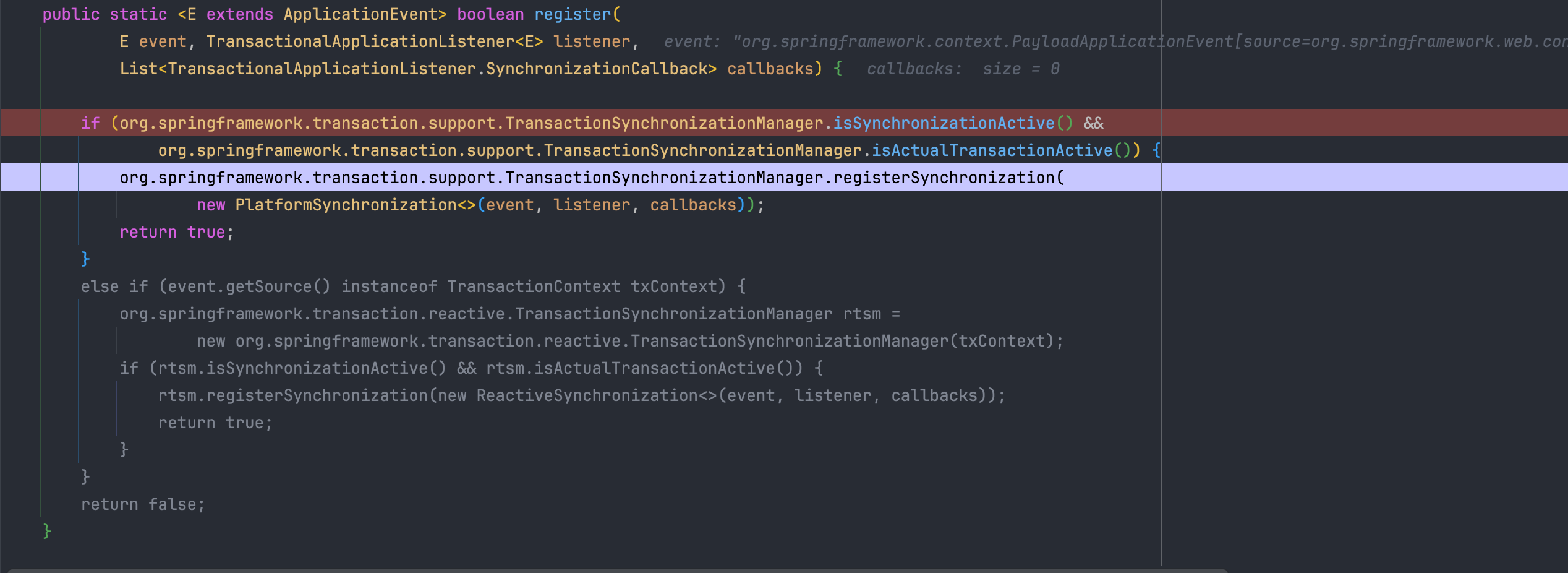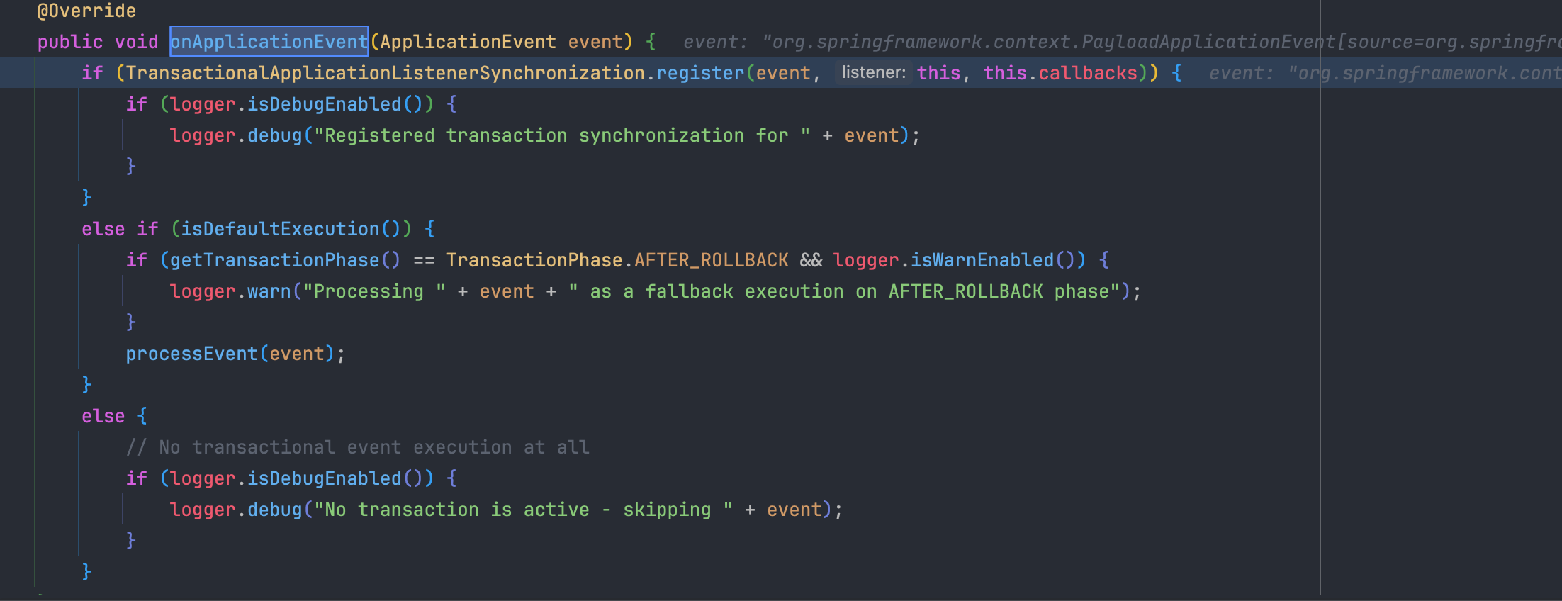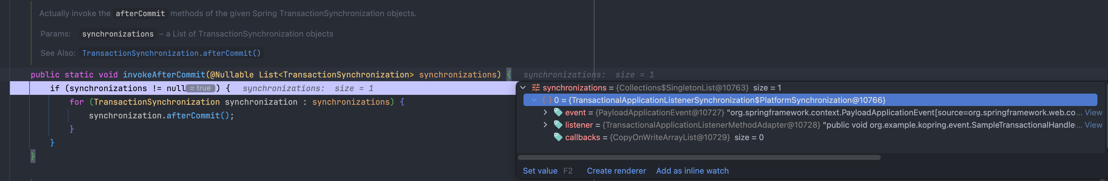 앞서 언급한 각 트리거 메서드들은 내부적으로 등록된 모든 TransactionSynchronization 콜백들을 순회하며 실행됩니다. 그렇다면 @TransactionalEventListener 역시 TransactionSynchronization의 구현체로 등록되어 트랜잭션 콜백의 일환으로 실행되는 것인지 직접 디버깅을 통해 그 동작 방식을 확인해 보겠습니다.