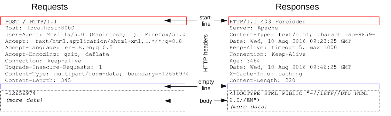 프로토콜(protocol)은 컴퓨터 내부 또는 컴퓨터 사이에서 데이터의 교환 방식을 정의하는 규칙 체계로 HTTP 요청 및 응답에 다음과 같은 규약을 따릅니다.
