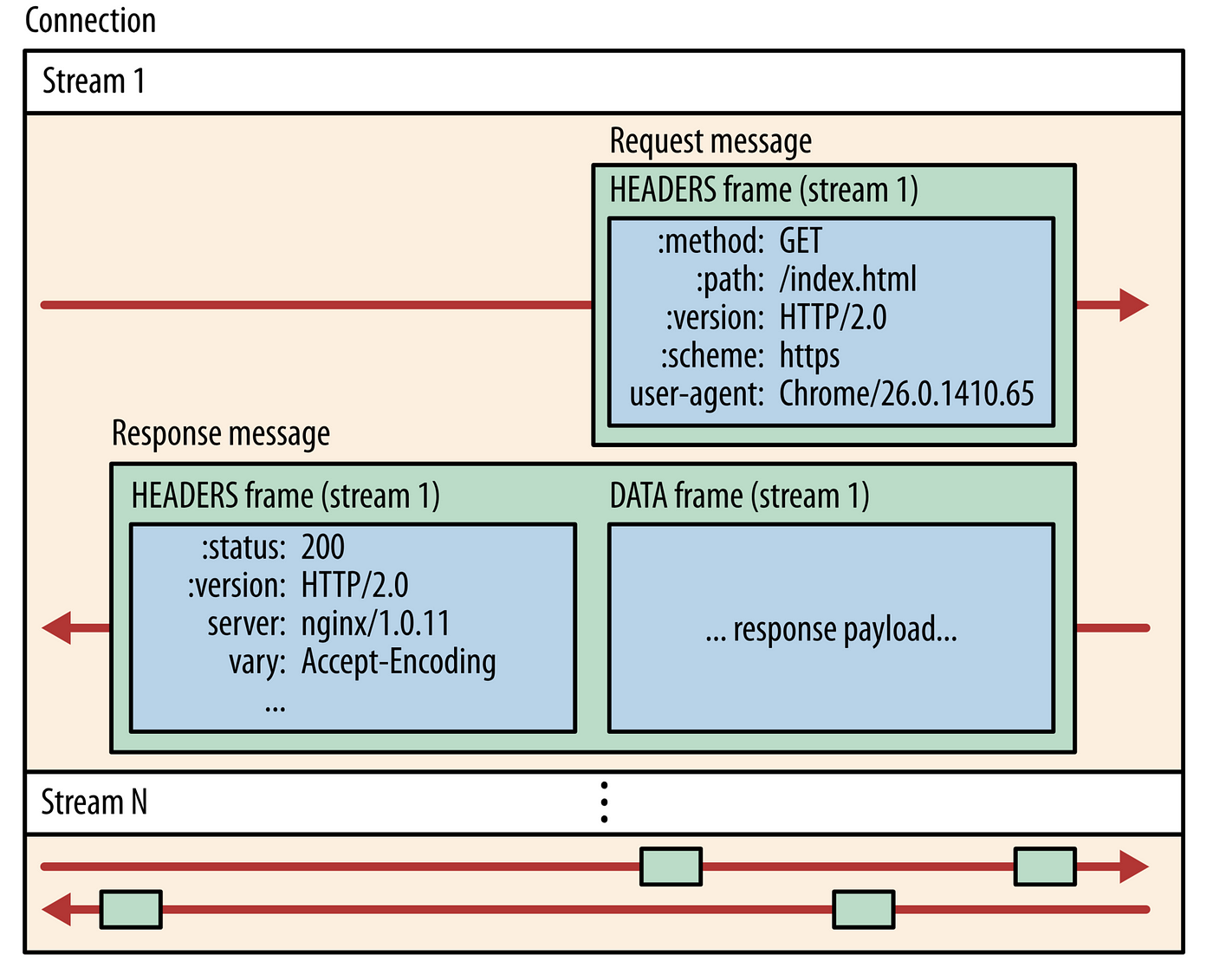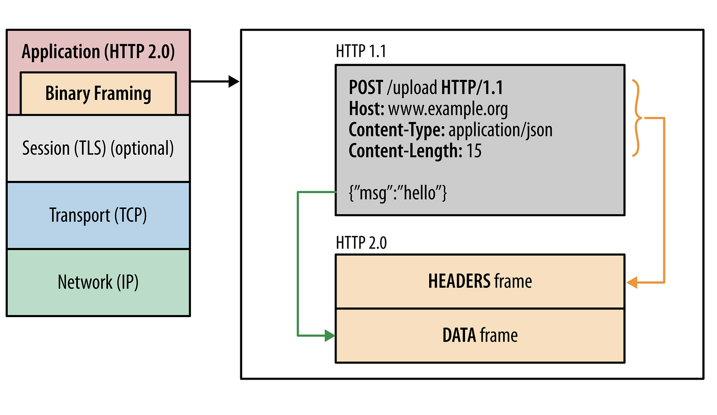 실제로 바이너리로 구성된 프레임을 직접 작성하는 것은 복잡하기 때문에 Binary Framing Layer 이미지로 대체하겠습니다.