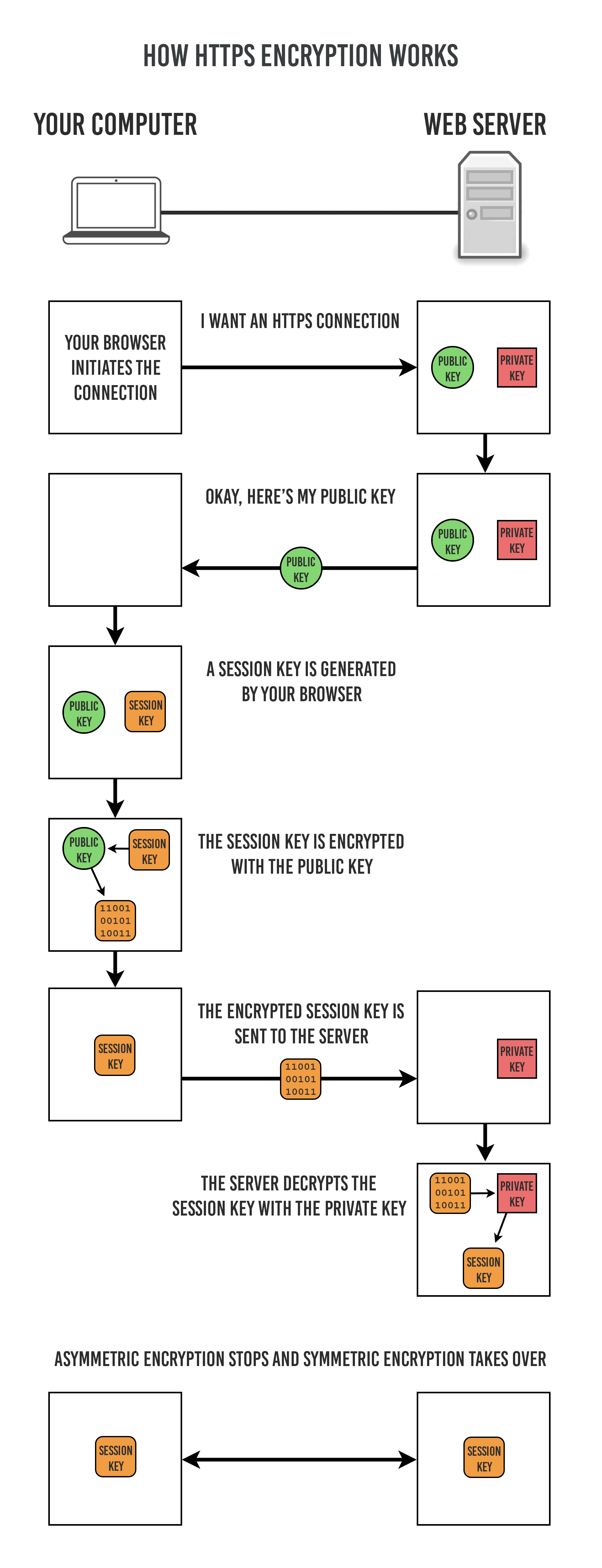 즉 HTTPS는 handshaking 과정에서 비대칭 키를 사용해 인증서(대칭 키)를 보내고 해당 인증서의 대칭 키를 안전하게 받았다면 연결 이후에는 해당 대칭 키(세션 키)를 사용해서 데이터를 암호화하고 해독합니다.